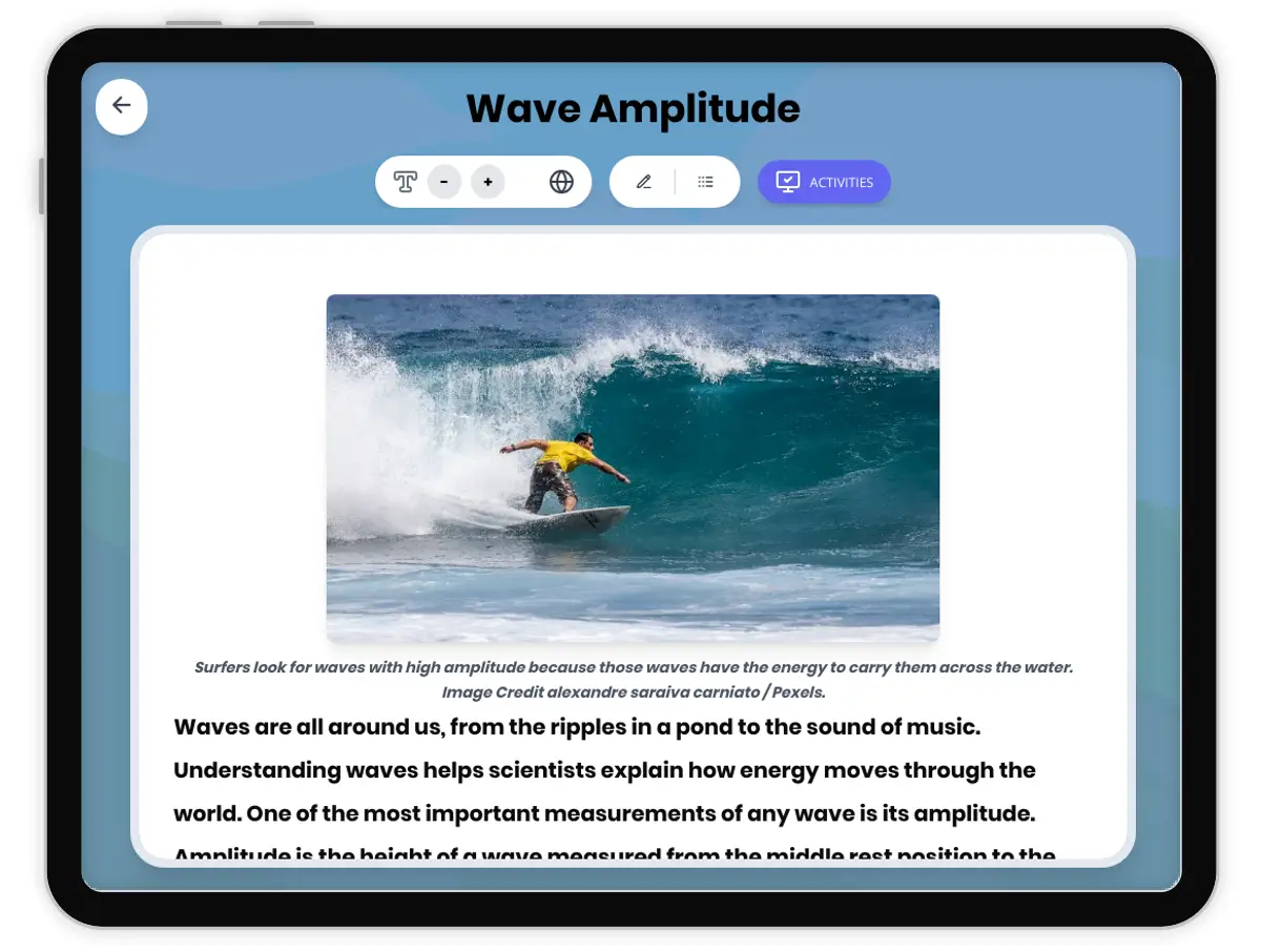 This engaging 350-word reading passage introduces Grade 4-5 students to the concept of wave amplitude and its relationship to wave energy. Aligned with NGSS standard 4-PS4-1, the passage explains how amplitude measures the height of a wave from its rest position to the crest or trough. Students learn that waves with larger amplitude carry more energy and produce bigger effects, connecting this concept to everyday experiences like louder sounds and powerful ocean waves. The passage includes clear definitions of key terms such as amplitude, crest, trough, and rest position. Real-world applications help students understand how amplitude affects sound volume and ocean wave power. Audio integration supports diverse learners, making complex scientific concepts accessible. The passage features concrete analogies using familiar experiences and ends with an interesting fact about the world's tallest recorded ocean wave. Supplementary activities include comprehension questions, writing prompts, and graphic organizers to reinforce understanding of wave properties and energy relationships.