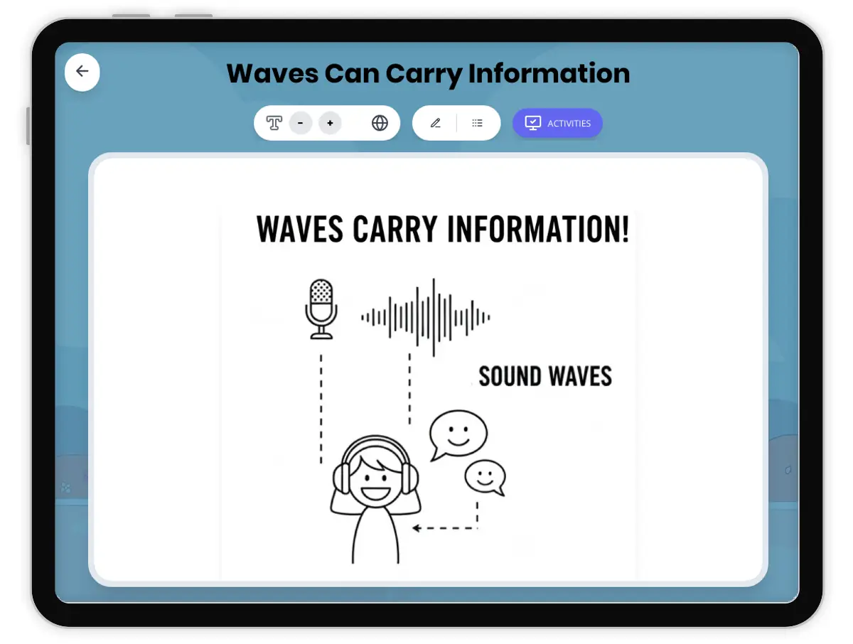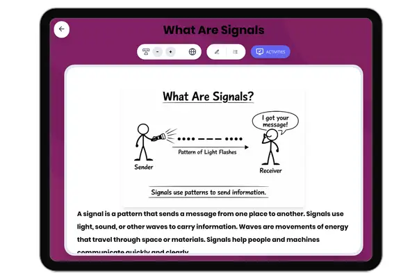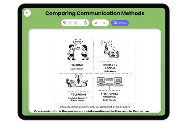 This 250-word reading passage introduces fourth-grade students to the fundamental concept that waves carry information from one place to another, aligned with NGSS standard 4-PS4-3 and Disciplinary Core Idea PS4.C. Students explore how sound waves carry voices during conversations, light waves carry images to our eyes, and digital patterns transmit messages through technology. The passage uses age-appropriate language and real-world examples like telephones, television, and walkie-talkies to help students understand wave-based communication. Audio-integrated features support diverse learners by providing text-to-speech options. The passage explains key vocabulary terms including waves, information, sound waves, light waves, digital patterns, and devices. Students learn that different types of waves serve different communication purposes and that technology converts information into wave patterns for transmission. Accompanying activities include multiple-choice comprehension questions, writing prompts that ask students to apply their understanding, and graphic organizers for comparing different wave types and analyzing cause-and-effect relationships in wave communication. This foundational knowledge prepares students for hands-on investigations and deeper exploration of how waves function as tools for communication in science and everyday life.