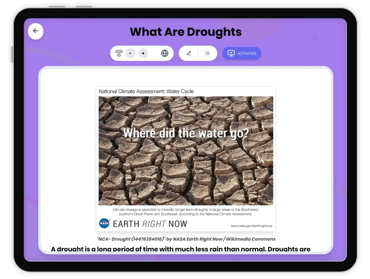 This 250-word reading passage introduces fourth-grade students to the concept of droughts as defined in NGSS 4-ESS3-2. Students learn that a drought is a long period of time with much less rain than normal, and unlike sudden natural hazards, droughts develop slowly over weeks, months, or even years. The passage explains how droughts affect rivers, lakes, soil, crops, and communities, causing water shortages for drinking, cooking, and bathing. Students discover how farmers lose crops, animals suffer from lack of water and food, and dry conditions increase wildfire risk. The content emphasizes that droughts can affect huge areas and millions of people simultaneously. Audio-integrated features support diverse learners. Activities include reading comprehension questions, writing prompts asking students to explain drought impacts and connect concepts to real-world scenarios, and graphic organizers for analyzing cause-and-effect relationships and comparing drought conditions. This standards-aligned resource builds foundational understanding of natural hazards and their human impact, preparing students for hands-on investigations and collaborative discussions about water conservation and community preparedness.