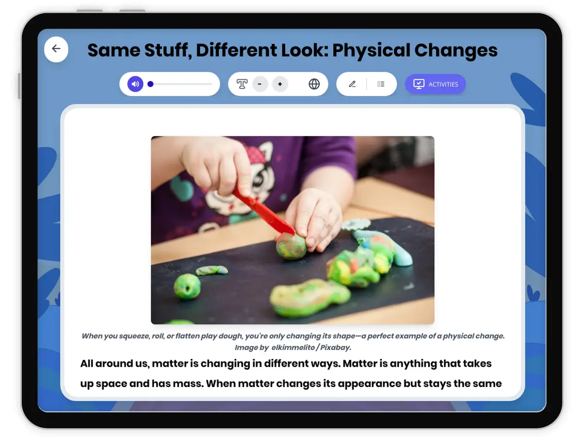 This engaging Grade 4-5 science passage introduces students to the concept of physical changes in matter, aligning with NGSS science standards. Learners will discover how matter can change its appearance, shape, or state—such as melting, freezing, or cutting—without becoming a different substance. The passage uses simple language, bolds and defines key vocabulary, and provides relatable real-world examples like melting ice or tearing paper. Activities include a multiple-choice quiz to check understanding and writing prompts to connect science with everyday life. Audio integration supports diverse learners. A glossary of important terms and a Spanish translation support bilingual classrooms and reinforce vocabulary. This resource is ideal for classroom instruction, homework, or independent study, helping students build a strong foundation in physical science concepts.