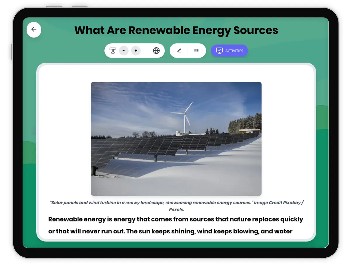 This 250-word reading passage introduces fourth-grade students to renewable energy sources as part of the NGSS 4-ESS3-1 standard. Students learn about energy from sources that nature replaces quickly, including sunlight, wind, and water. The passage contrasts renewable energy with fossil fuels, helping students understand why renewable sources are important for Earth's future. Audio-integrated content supports diverse learners by providing both visual and auditory access to the material. The passage uses age-appropriate language and real-world examples to build foundational understanding of ESS3.A: Natural Resources. Students explore how solar panels, wind turbines, and water wheels capture energy from nature. Activities include comprehension questions, writing prompts, and graphic organizers that reinforce key vocabulary like renewable energy, fossil fuels, solar energy, wind energy, and hydropower. This standards-aligned resource prepares students for hands-on investigations and class discussions about energy and natural resources.