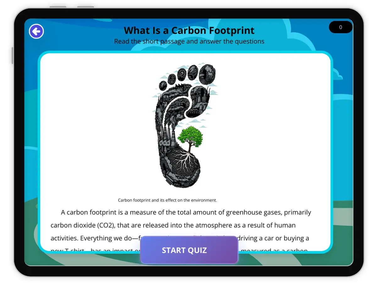 A carbon footprint is the measure of the total amount of greenhouse gases, primarily carbon dioxide (CO2), released by human activities. This reading passage, aligned with the NGSS disciplinary core idea of Earth and Human Activity (ESS), defines key terms and explains how daily actions contribute to our environmental impact. It explores the main sources of a carbon footprint, such as burning fossil fuels for energy and transportation, and provides practical ways for individuals to reduce their footprint through sustainable practices like recycling, conserving water, and using renewable energy. The passage is designed to help students understand the connection between their actions and global warming and climate change. With its simple language and clear definitions, this resource makes the complex concept of a carbon footprint accessible to students, encouraging them to think critically about their role in protecting the environment. The content is also audio-integrated, offering a comprehensive and engaging learning experience.