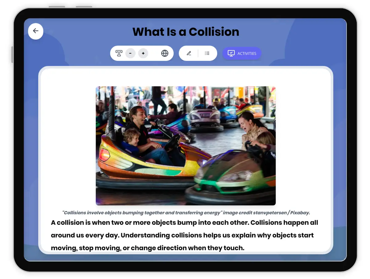 This engaging science passage introduces Grade 4-5 students to the concept of collisions and energy transfer, aligned with NGSS standard 4-PS3-3. Students learn how collisions occur when two or more objects bump into each other, causing energy to transfer between them. The passage explains how collisions create changes in motion and energy as objects push against each other during contact. Using the familiar example of playing pool, where a cue ball hits other balls and transfers energy to make them move, students can visualize this abstract concept. The passage includes audio integration for enhanced learning accessibility. Key vocabulary terms like collision, energy transfer, contact, and motion are introduced naturally within the text. Students explore cause-and-effect relationships and understand how energy moves from one object to another during collisions. Accompanying activities include multiple-choice questions testing recall and comprehension, writing prompts requiring students to explain collision concepts, and graphic organizers that help students analyze cause-and-effect relationships and sequence the collision process. This comprehensive resource provides differentiated instruction with simplified versions and Spanish translations to support all learners.