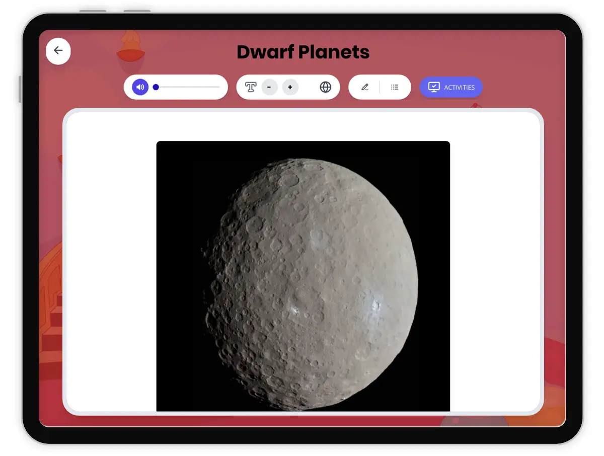 This Grade 4-5 science passage, aligned with NGSS standards, introduces students to dwarf planets—a new category in our solar system. Students will learn how dwarf planets differ from regular planets, why Pluto was reclassified, and the meaning of important terms like 'orbit' and 'gravity.' Real-world examples, such as Ceres and Eris, make the topic engaging and relatable. The passage features a glossary, Spanish translation, an interactive multiple-choice quiz, and writing prompts that encourage deeper understanding and connections with everyday life. Audio integration supports diverse learning styles, making this resource ideal for classroom or home use. Students will explore why scientists created the dwarf planet category and how it helps us better understand our solar system. Key vocabulary, fun facts, and critical thinking activities ensure a comprehensive and enjoyable learning experience for young scientists.