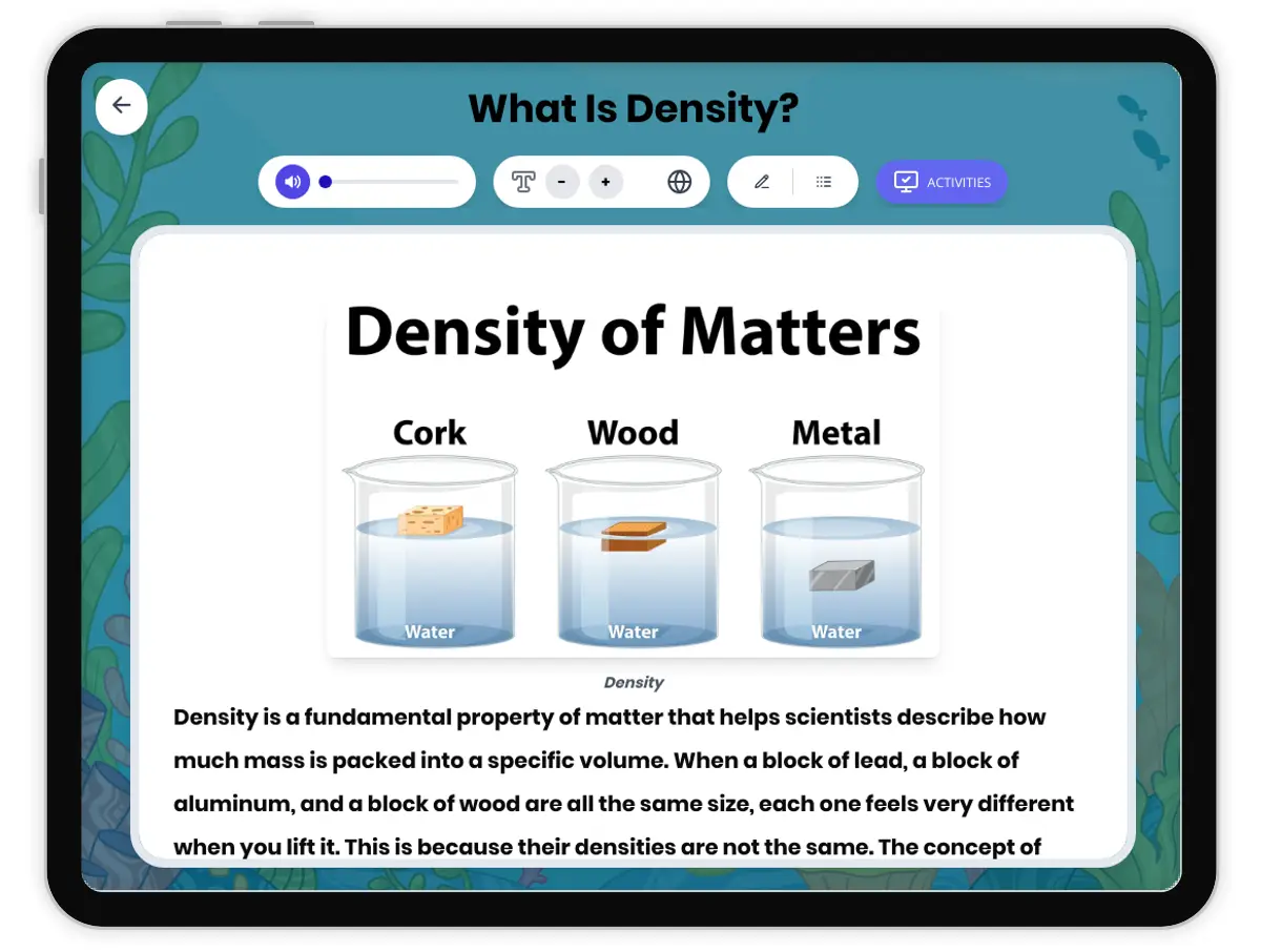 This comprehensive science passage introduces middle school students (grades 6-8) to the concept of density, aligned with NGSS standard MS-PS1-1. Students will learn how density describes how tightly packed matter is, discover the formula D = m/v, and explore examples comparing materials like lead, aluminum, and wood. The passage emphasizes density as an intensive property, meaning it does not change with sample size, and demonstrates real-world applications in technology and the environment. Included are a glossary, Spanish translation, differentiated and accessible versions, multiple-choice and writing activities, and graphic organizers, making it ideal for diverse classrooms. Audio integration supports listening comprehension. This resource deepens scientific understanding and vocabulary, fostering the ability to explain and analyze physical properties of matter.