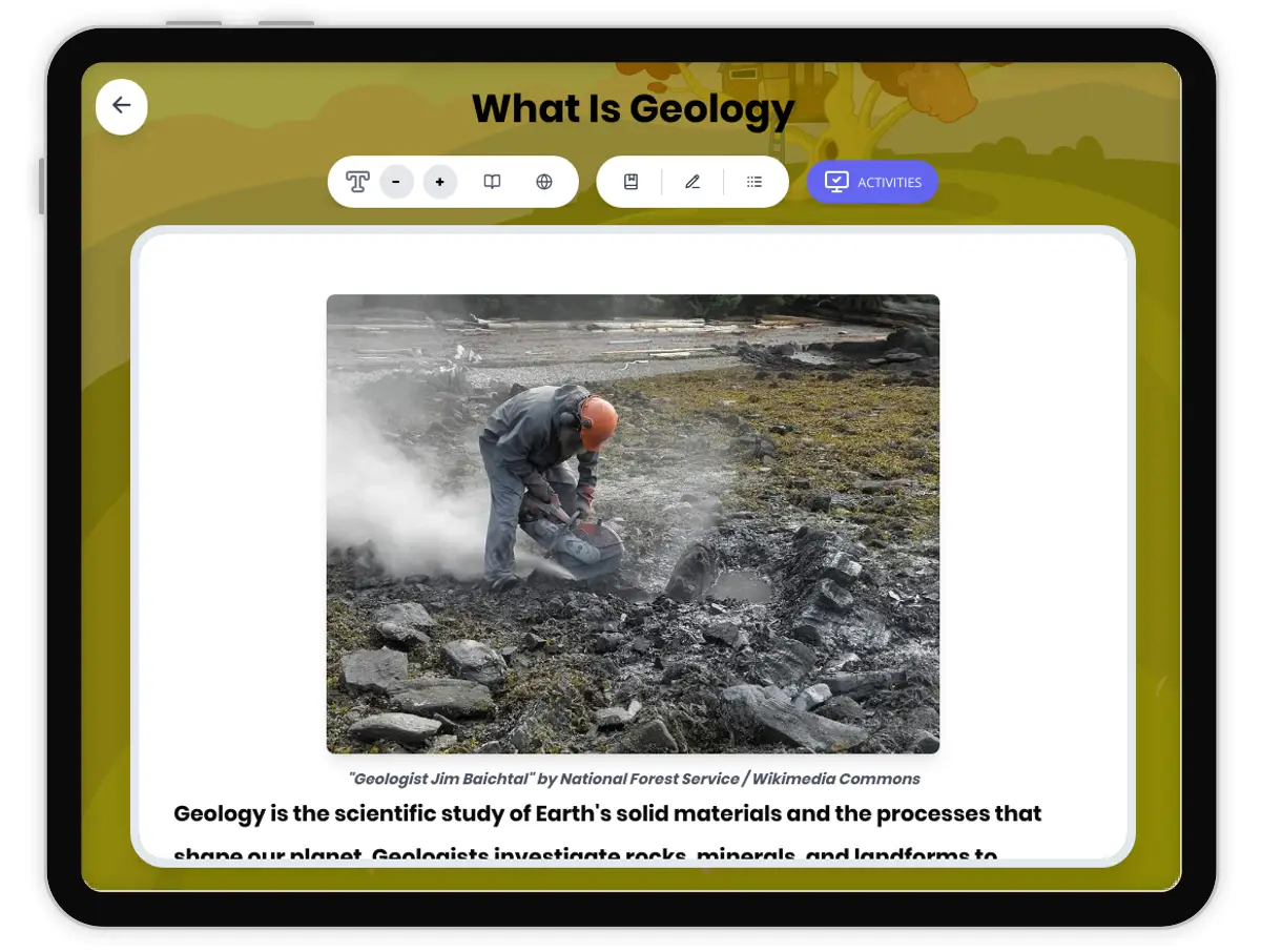This comprehensive reading passage introduces middle school students to geology, the scientific study of Earth's solid materials and the processes that shape our planet. Students will learn about rocks, minerals, and how geologists investigate Earth's structure and landforms. The passage covers key concepts including the three main rock types, mineral properties, and geological processes like weathering and erosion that continuously modify Earth's surface. Aligned with NGSS standard MS-ESS2-1, this resource helps students understand Earth's systems and the dynamic nature of our planet. The passage includes audio integration for enhanced accessibility, a simplified version for struggling readers, Spanish translations, vocabulary glossary, comprehension questions, writing activities, and graphic organizers. Perfect for grades 6-8 science curriculum, this material supports diverse learners while maintaining rigorous content standards and promoting scientific literacy in Earth science.