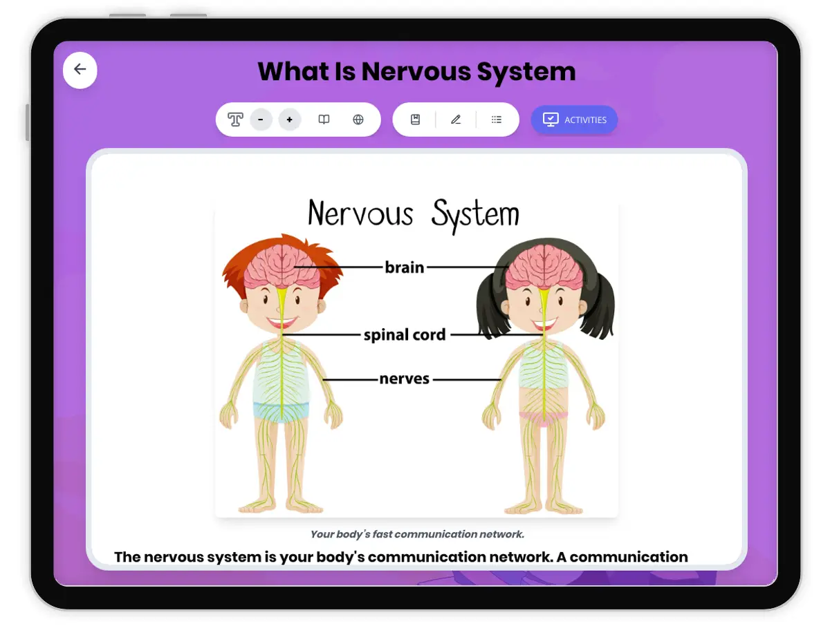 This Grade 4 science reading passage introduces students to the nervous system as the body's communication network aligned with NGSS standard 4-LS1-2. Students learn how the brain, spinal cord, and nerves work together to send and receive messages throughout the body. The passage uses a relatable phone system analogy to help students understand how information travels from the brain to all parts of the body and back. Students explore how the nervous system helps the body sense and respond to the environment. This audio-integrated educational resource includes a simplified differentiated version, Spanish translations, glossary of key terms, multiple-choice comprehension questions, writing activities, and graphic organizers. The passage builds foundational understanding of LS1.A (Structure and Function) and LS1.D (Information Processing) disciplinary core ideas, preparing students for hands-on investigations about how organisms process information and respond to their environment.