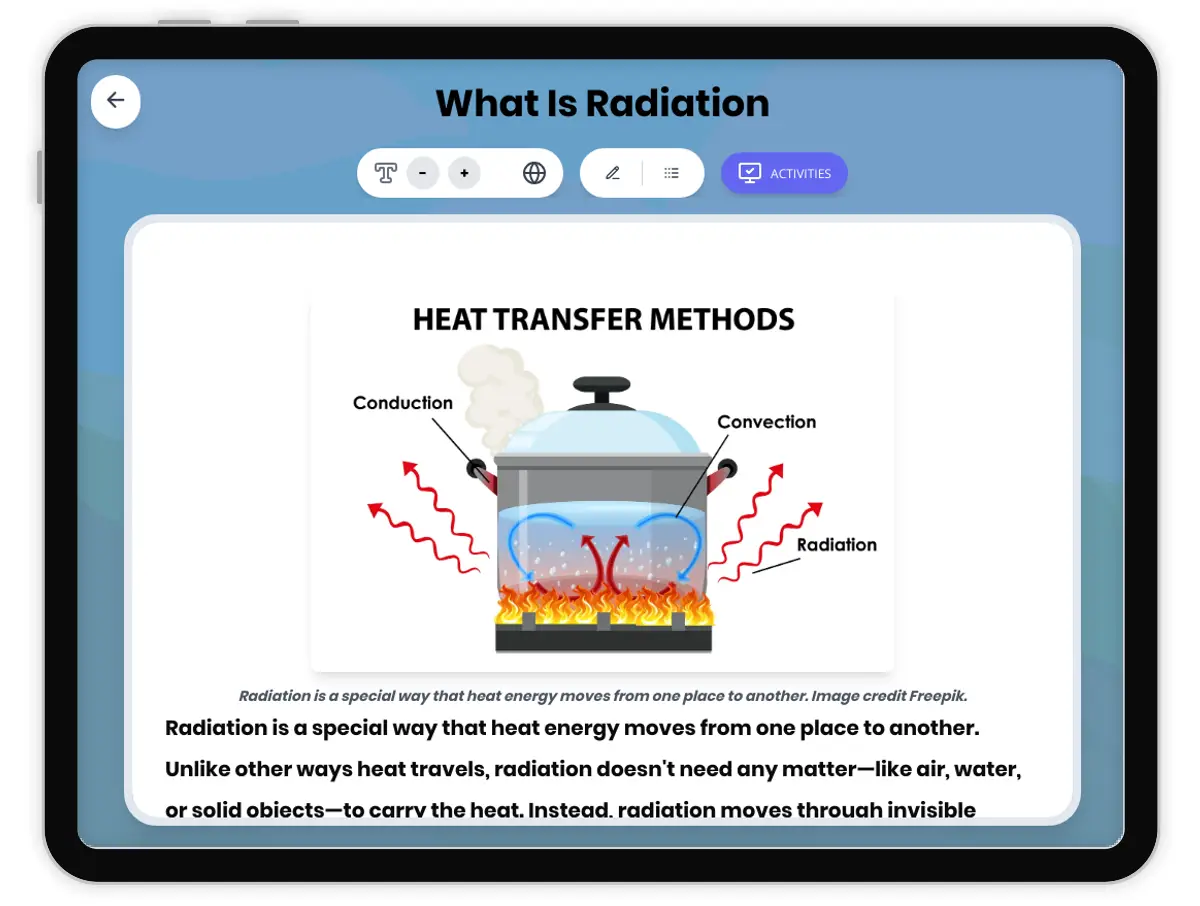This engaging Grade 4-5 science passage explores radiation as a method of heat energy transfer, aligned with NGSS standard 4-PS3-4. Students discover how radiation works differently from conduction and convection by traveling through invisible waves that don't need matter to move. The passage explains how the Sun's heat reaches Earth by traveling 93 million miles through the emptiness of space using radiation energy. Through relatable examples like feeling warmth on your face from the Sun or heat from a campfire, students understand this abstract scientific concept. The audio-integrated reading passage includes a simplified differentiated version, Spanish translations, glossary terms, multiple-choice questions testing recall and comprehension, writing activities requiring explanation and application, and graphic organizers for comparing heat transfer methods. This comprehensive resource helps elementary students grasp how radiation enables energy transfer across vast distances without physical contact or air, making it essential for understanding Earth's energy from the Sun.
