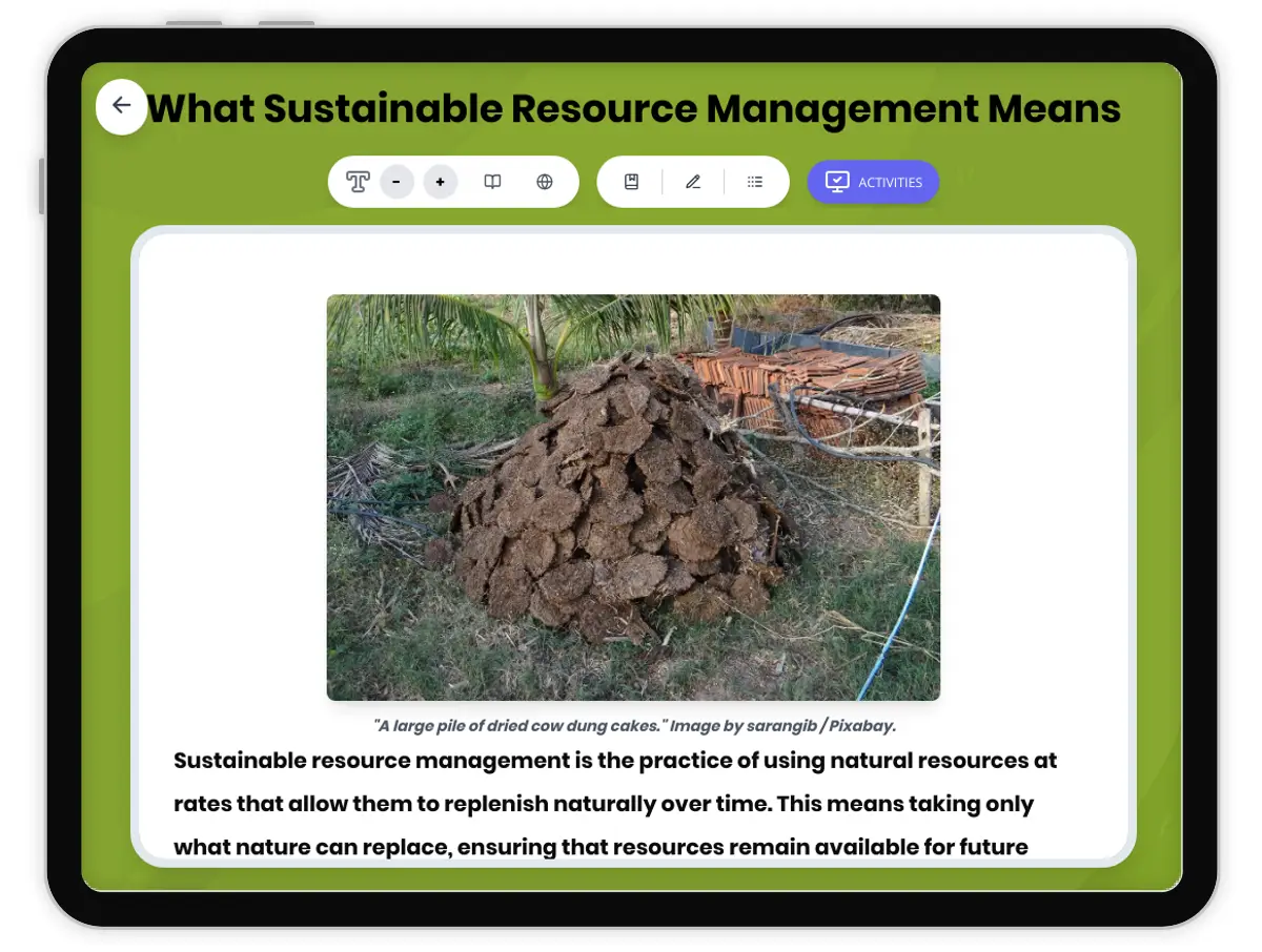 This middle school science passage explores sustainable resource management, aligned with NGSS standard MS-ESS3-3. Students learn how sustainable resource management means using natural resources at rates that allow them to replenish naturally. The passage examines sustainable agriculture practices like crop rotation and organic farming, sustainable forestry methods including selective logging, sustainable fisheries management through catch limits, and water management strategies for long-term availability. Real-world examples help students understand how these practices balance human needs with ecosystem health. The content includes audio integration for enhanced accessibility, along with differentiated versions for English Language Learners and struggling readers. Activities include comprehension questions, writing prompts, and graphic organizers to reinforce understanding of how sustainable practices protect resources for future generations while meeting current needs.