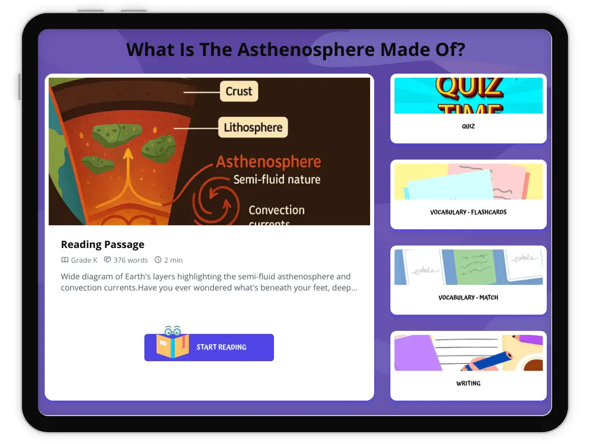This educational passage, 'What Is The Asthenosphere Made Of?', delves into the fascinating composition and characteristics of the asthenosphere, a crucial layer within Earth's mantle. Designed for Grade 6 students, it explains key concepts like Earth's layers, plate tectonics, and the movement of molten rock. The passage aligns with NGSS standard MS-ESS2-1, focusing on the cycling of Earth's materials and the energy that drives these processes. Students will learn about the semi-fluid nature of the asthenosphere and its connection to volcanic activity and earthquakes. The content is audio integrated, making it accessible for diverse learners, and includes engaging activities to reinforce understanding of this vital part of our planet.