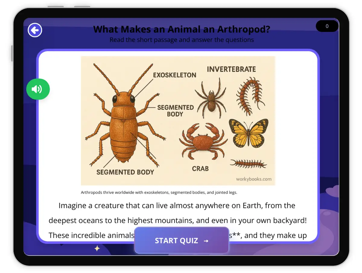 This educational reading passage, 'What Makes an Animal an Arthropod?', dives into the fascinating world of arthropods, the largest group of invertebrates. Students will learn about the defining characteristics of these creatures, such as their **exoskeletons**, **segmented bodies**, and **jointed appendages**. The passage explains how these features help arthropods survive and thrive in diverse environments. Key vocabulary like 'invertebrate,' 'molting,' and different arthropod groups (insects, arachnids, crustaceans, myriapods) are clearly defined. This content is designed for a Grade 6 reading level and aligns with NGSS MS-LS4-2, encouraging students to understand anatomical similarities and differences among organisms. The passage is also audio integrated for enhanced learning, making it accessible and engaging for all students.