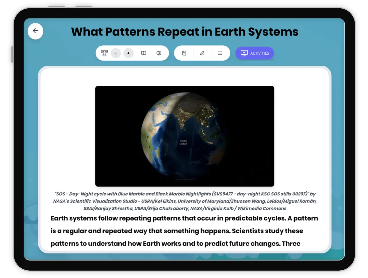 This comprehensive 650-word reading passage introduces middle school students to the concept of patterns in Earth systems, specifically focusing on seasons, erosion cycles, and ocean currents. Students will learn how Earth's tilt creates seasonal patterns, how weathering and erosion follow predictable cycles, and how wind patterns drive ocean currents in consistent loops. The passage aligns with NGSS standard MS-ESS2-1, helping students identify repeating patterns in Earth systems and explain why they occur. Each passage includes audio integration for accessibility, a simplified differentiated version for struggling readers, Spanish translations, a comprehensive glossary of key scientific terms, multiple-choice comprehension questions, writing activities, and graphic organizers. The materials support students in understanding how energy from the sun and Earth's rotation create predictable patterns that shape our planet's surface and climate. This resource provides teachers with complete curriculum materials for teaching about Earth system patterns while meeting diverse learning needs in grades 6-8.