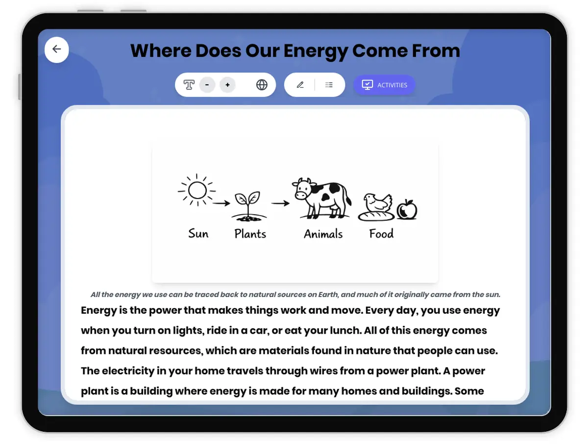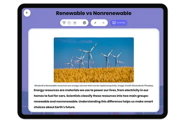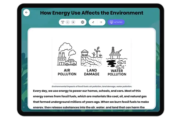 This 250-word reading passage aligns with NGSS standard ESS3.A and introduces fourth-grade students to the fundamental concept that energy and fuels humans use are derived from natural sources. Students explore how electricity in their homes comes from power plants that burn fuels or capture energy from wind, water, or sunlight. They learn that gasoline for cars originates from oil pumped from underground, and food energy comes from plants that captured energy from the sun. The passage uses age-appropriate language and real-world examples to help students trace everyday energy use back to its natural source. Audio integration supports diverse learners by providing multiple ways to access the content. This foundational understanding prepares students for hands-on investigations about energy transformation and conservation. The passage includes bolded vocabulary terms with immediate definitions, concrete analogies, and connections to students' daily experiences. Accompanying activities include reading comprehension questions, writing prompts, and graphic organizers that reinforce the core science concept while building literacy skills across the curriculum.
