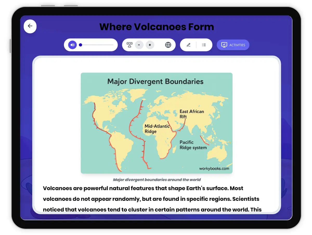 This middle school science passage, aligned to NGSS MS-ESS2-2, investigates why volcanoes form in specific locations around the globe. Students will learn how the movement and interaction of Earth's tectonic plates create conditions for different types of volcanoes, such as those found at subduction zones, divergent boundaries, and hot spots. The passage explains key concepts like the Ring of Fire, mid-ocean ridges, volcanic arcs, and the difference between active, dormant, and extinct volcanoes. Real-world examples, such as Hawaii, Iceland, and the Andes, help students understand the global patterns of volcanic activity. The resource includes a glossary, Spanish translation, differentiated version for struggling readers, comprehension questions, writing prompts, and graphic organizers. Audio integration supports accessibility and deeper learning. Ideal for grades 6-8 classrooms.