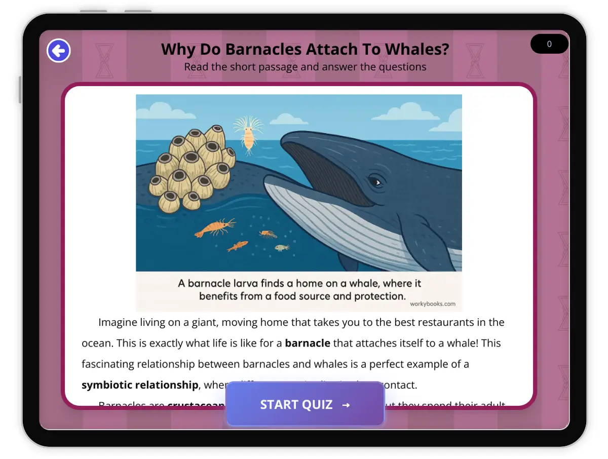 This engaging, audio-integrated reading passage explores the intriguing relationship between barnacles and whales, focusing on why these small crustaceans attach to giant marine mammals. Students will learn about symbiotic relationships, specifically **commensalism**, and how this interaction benefits barnacles without harming or helping whales. The passage defines key terms like **filter feeders** and **plankton**, enhancing vocabulary and scientific understanding. This content aligns with NGSS standard MS-LS2-2, which focuses on constructing explanations for patterns of interactions among organisms across multiple ecosystems. Through this passage, students will gain insight into **ecological interactions** in **marine environments** and how different species depend on each other.