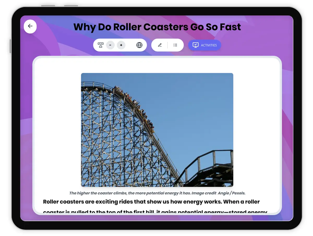 This engaging 250-word reading passage helps Grade 4 students understand energy transformation through the familiar context of roller coasters. Aligned to NGSS standard 4-PS3-3, the passage explains how gravitational potential energy converts to kinetic energy as a roller coaster moves from the top of a hill to the bottom. Students learn why the first hill must be the tallest and why subsequent hills get progressively shorter due to energy loss from friction and air resistance. The passage uses age-appropriate language and real-world examples to build foundational understanding of key concepts including potential energy, kinetic energy, energy transformation, friction, and air resistance. Audio-integrated features support diverse learners by providing text-to-speech functionality. The passage includes bolded vocabulary terms with immediate definitions, making complex physics concepts accessible to fourth graders. Complementary activities include multiple-choice questions testing recall and comprehension, writing prompts requiring students to explain and apply energy concepts, and graphic organizers that help students visualize the cause-and-effect relationships in energy transformation. This resource provides teachers with a complete lesson package for introducing physical science concepts in an exciting, memorable way.