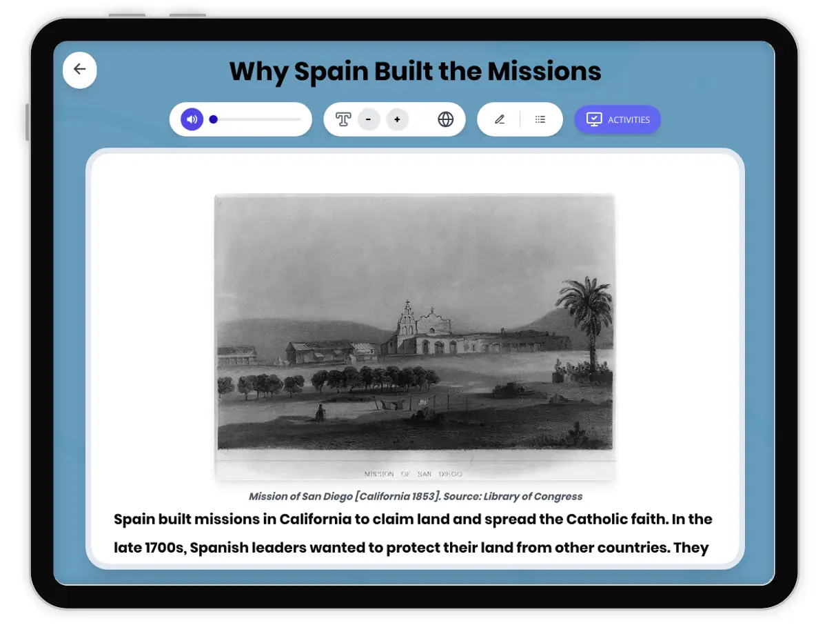This engaging U.S. history reading passage explores why Spain built missions during the Mission Period and Rancho Era in California, focusing on Westward Expansion. Students learn about the causes and effects of Spanish settlement, the daily life at missions, and interactions between Native Americans and Spanish settlers. The resource includes a glossary, a Spanish translation, and standards-aligned activities such as comprehension questions, writing prompts, and graphic organizers. Students will analyze key vocabulary, create timelines, and make connections between past and present. This history reading passage is aligned to C3 Framework and Common Core standards, and features read aloud audio and a Spanish translation to support all learners.