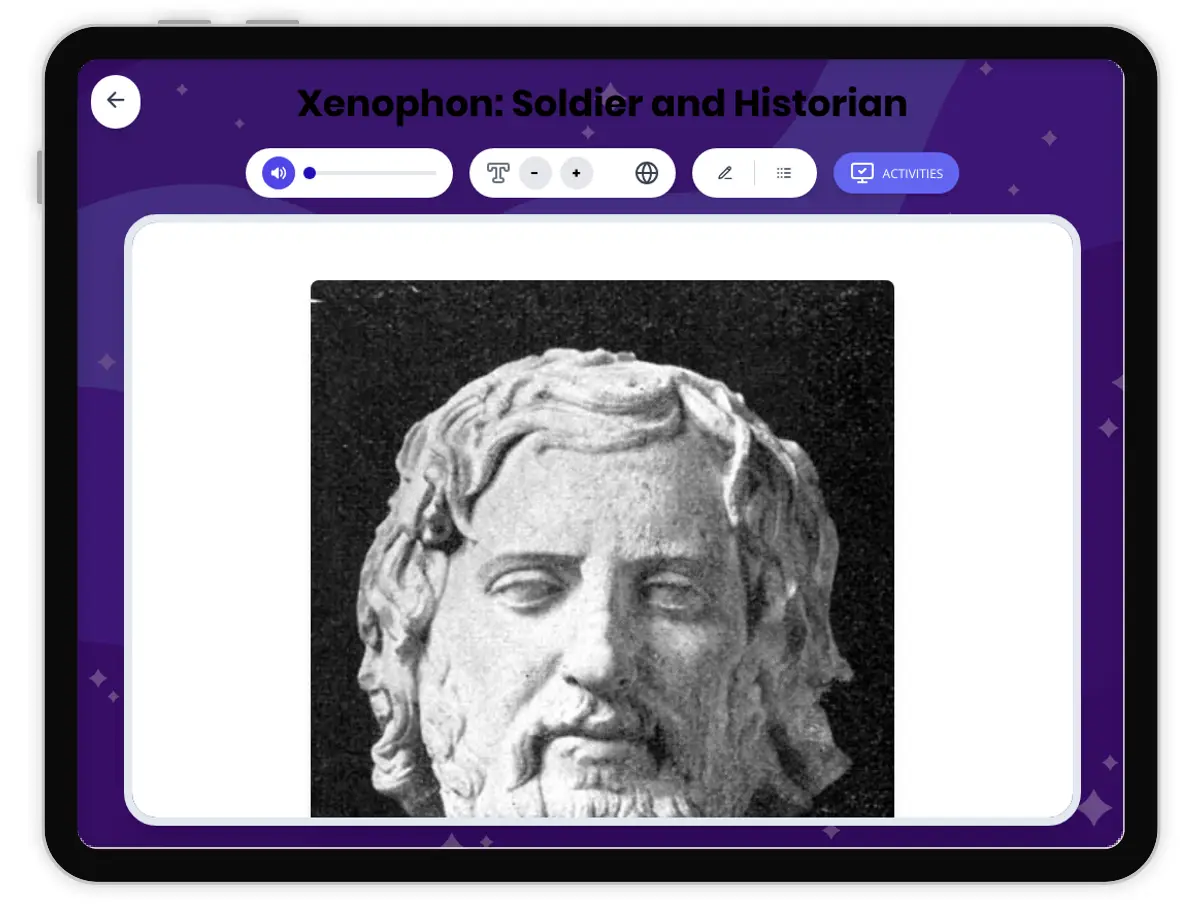 This history reading passage explores the life and significance of Xenophon, a notable ancient Greek soldier, historian, and writer. Students will learn about Xenophon’s military adventures, his works documenting Greek life and politics, and his connections to Socrates and Sparta. The passage includes vocabulary support, a Spanish translation, audio, and activities to deepen understanding. Aligned with CA HSS 6.4.2 and CCSS RH.6-8.1, this resource challenges students to analyze cause and effect, use evidence, and understand the impact of historical figures on ancient and modern societies. The reading also supports ELA skills through comprehension questions and writing prompts, and features a timeline, glossary, and graphic organizers to promote critical thinking and historical literacy.