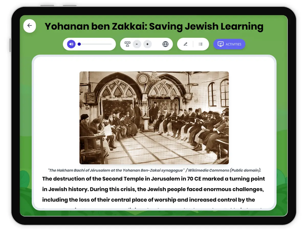 This passage explores the pivotal role of Yohanan ben Zakkai in preserving Jewish learning and tradition after the destruction of the Second Temple in 70 CE. Students will learn about the challenges faced by the Jewish people during this critical period in ancient history, including Roman rule and the loss of their central place of worship in Jerusalem. The passage highlights Yohanan ben Zakkai’s leadership, the founding of the academy at Yavne, and the adaptation of Jewish religious life. Activities include a glossary of key terms, multiple-choice quiz, timeline, and graphic organizers, all designed to help students analyze cause and effect and understand change over time. This passage is aligned with CA HSS 6.3.5 and CCSS RH.6-8.1, and includes a Spanish translation and read aloud audio for accessibility. Students are encouraged to think like historians, using evidence and evaluating the lasting impact of Yohanan ben Zakkai’s actions on world history.