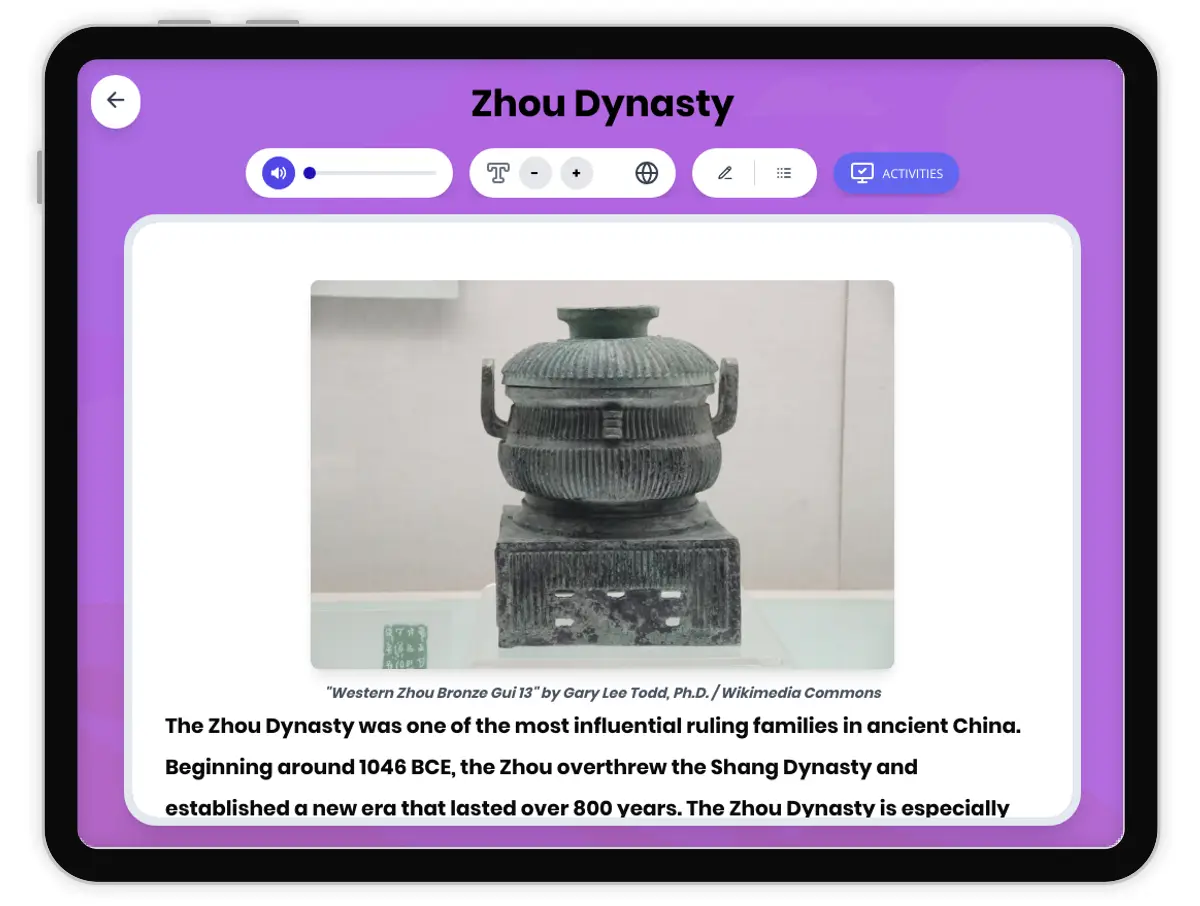 This history reading passage explores the Zhou Dynasty and the Mandate of Heaven, important concepts in Ancient China. Students will read about the rise of the Zhou, their system of government, and the belief that rulers were chosen by a divine power. The passage discusses how geography shaped the Zhou society, the evidence left behind in archaeological sources, and the effects of these beliefs on daily life and later Chinese history. Activities include a multiple-choice quiz, writing prompts, and graphic organizers. This resource is aligned with CA HSS 6.6 and CCSS RH.6-8.1-4, and includes a Spanish translation and read aloud audio to support diverse learners.