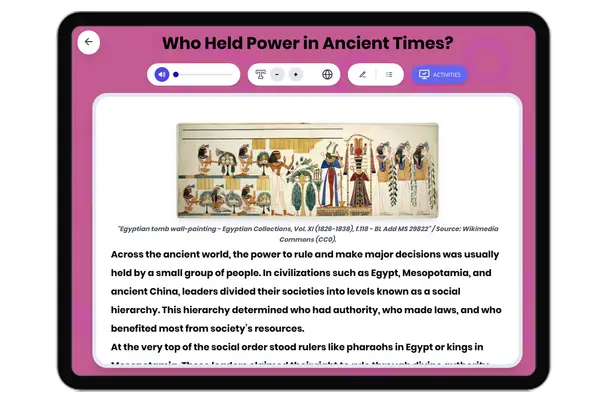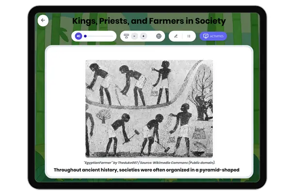 This engaging history reading passage explores the pyramid structure of ancient societies, focusing on the roles of king...