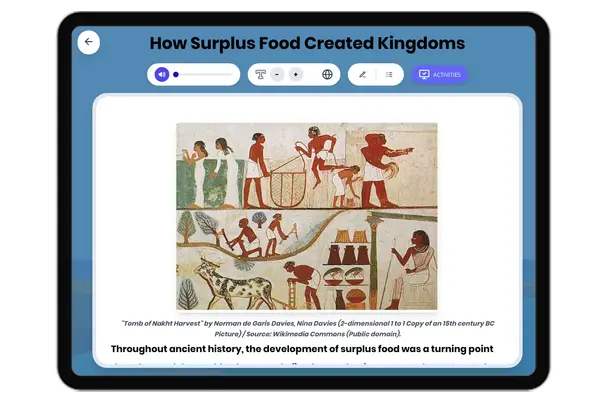 This history reading passage explores how surplus food enabled the rise of ancient civilizations and kingdoms. Students ...