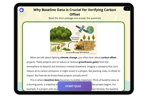 This educational passage, audio integrated, explains why **baseline data** is essential for **verifying carbon offset pr...