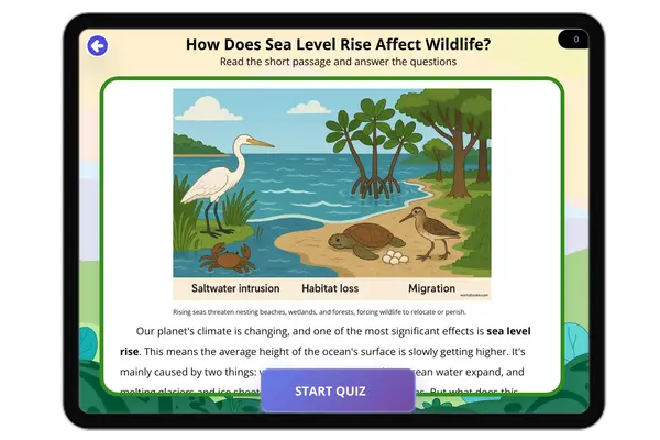 This educational content features a reading passage titled 'How Does Sea Level Rise Affect Wildlife?' designed for Grade...