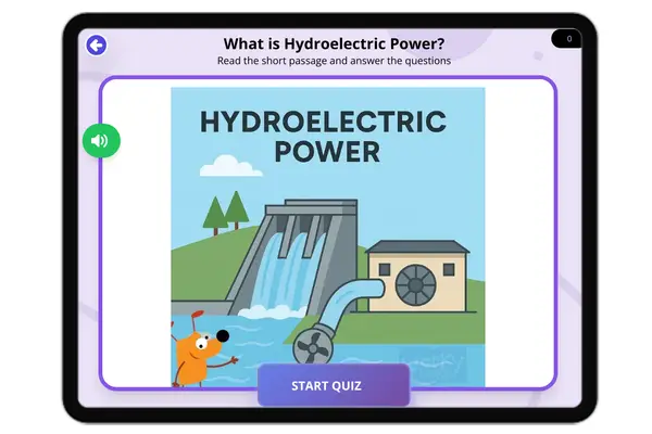 This reading passage introduces middle school students to hydroelectric power, a form of renewable energy created by mov...