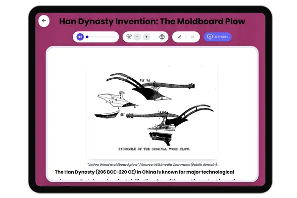 This engaging history reading passage explores the development and impact of the moldboard plow during the Han Dynasty i...