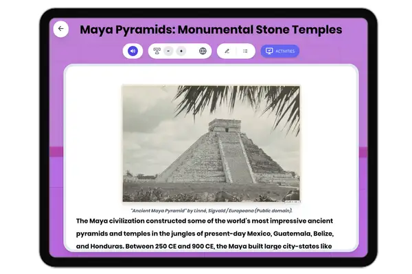 This detailed history reading passage explores the monumental stone pyramids built by the Maya civilization in Mesoameri...