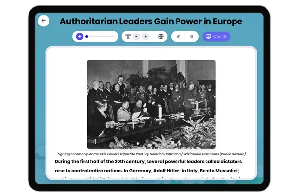 This engaging history reading passage explores the rise of dictators Adolf Hitler, Benito Mussolini, and Hideki Tojo dur...