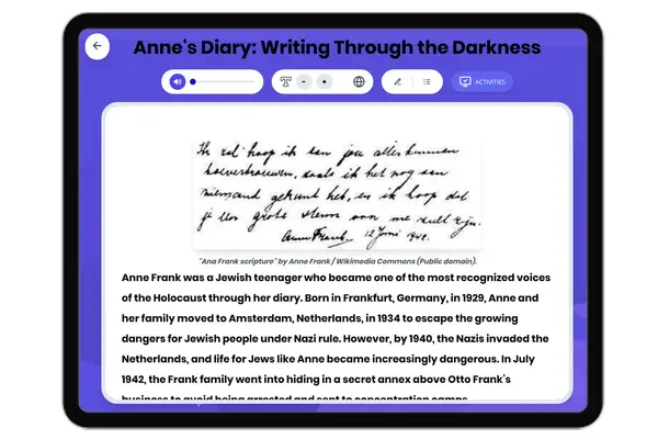 This history reading passage explores the life of Anne Frank, a Jewish teenager whose diary became one of the most impor...