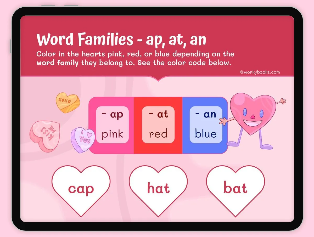 Word Families - ap, at, an is an engaging phonics activity that helps young learners recognize and categorize words with similar ending sounds. This interactive and printable worksheet, that aligns with the Common Core State Standards, Word Families - ap at an presents nine common CVC (consonant-vowel-consonant) words arranged in heart shapes, which students must color according to their word family. The worksheet uses a clear color-coding system with pink for -ap words, red for -at words, and blue for -an words.