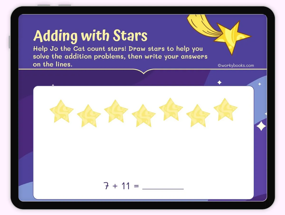 - Problem-solving strategies: By drawing stars to represent the addends, your child will learn a visual and concrete approach to solving addition problems.