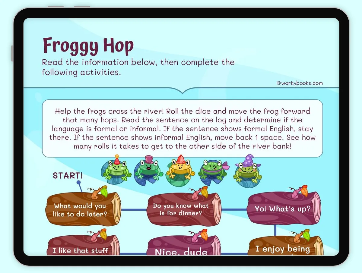 This interactive and printable worksheet,, "Froggy Hop," is a fun and engaging learning activity designed to help children practice their understanding of formal and informal English. The worksheet guides the players through a game-like scenario where they must help a frog cross a river by rolling dice and moving the frog forward. Along the way, they encounter different sentences that showcase either formal or informal language, and they must decide whether to stay on the current space or move back one space accordingly.