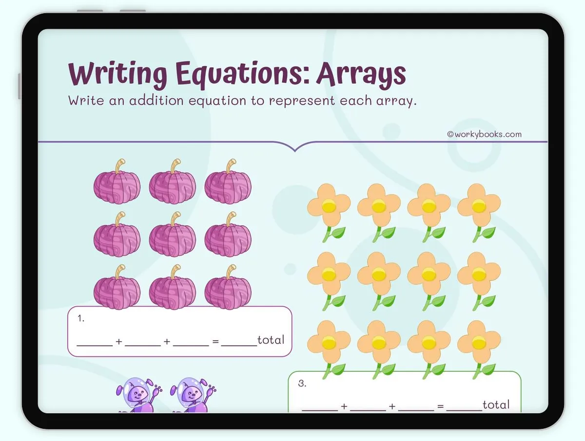 - Writing accurate addition equations to represent the total number of objects in an array.