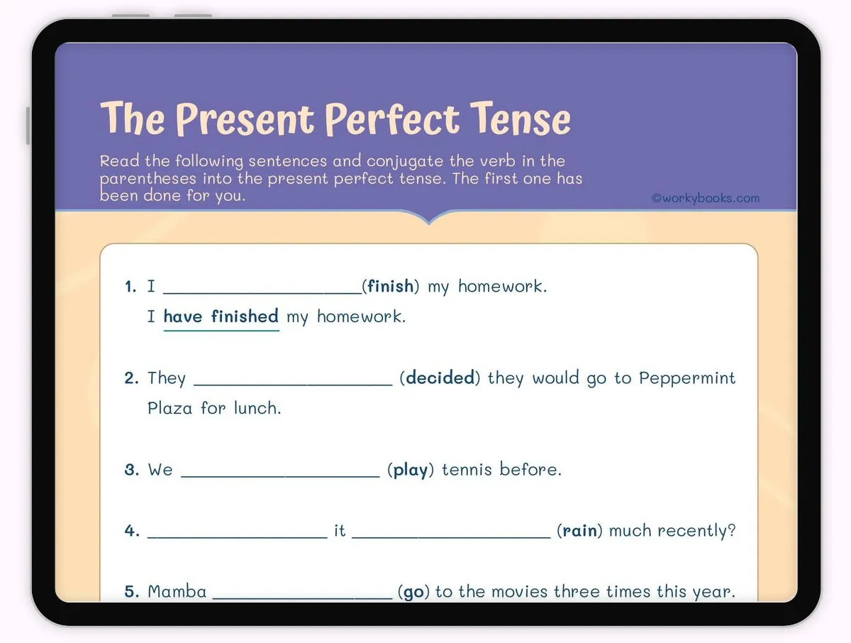 present perfect tense, verb conjugation, grammar practice, English language learning, tense usage, sentence completion, writing skills, middle school English, language arts, grammar exercises